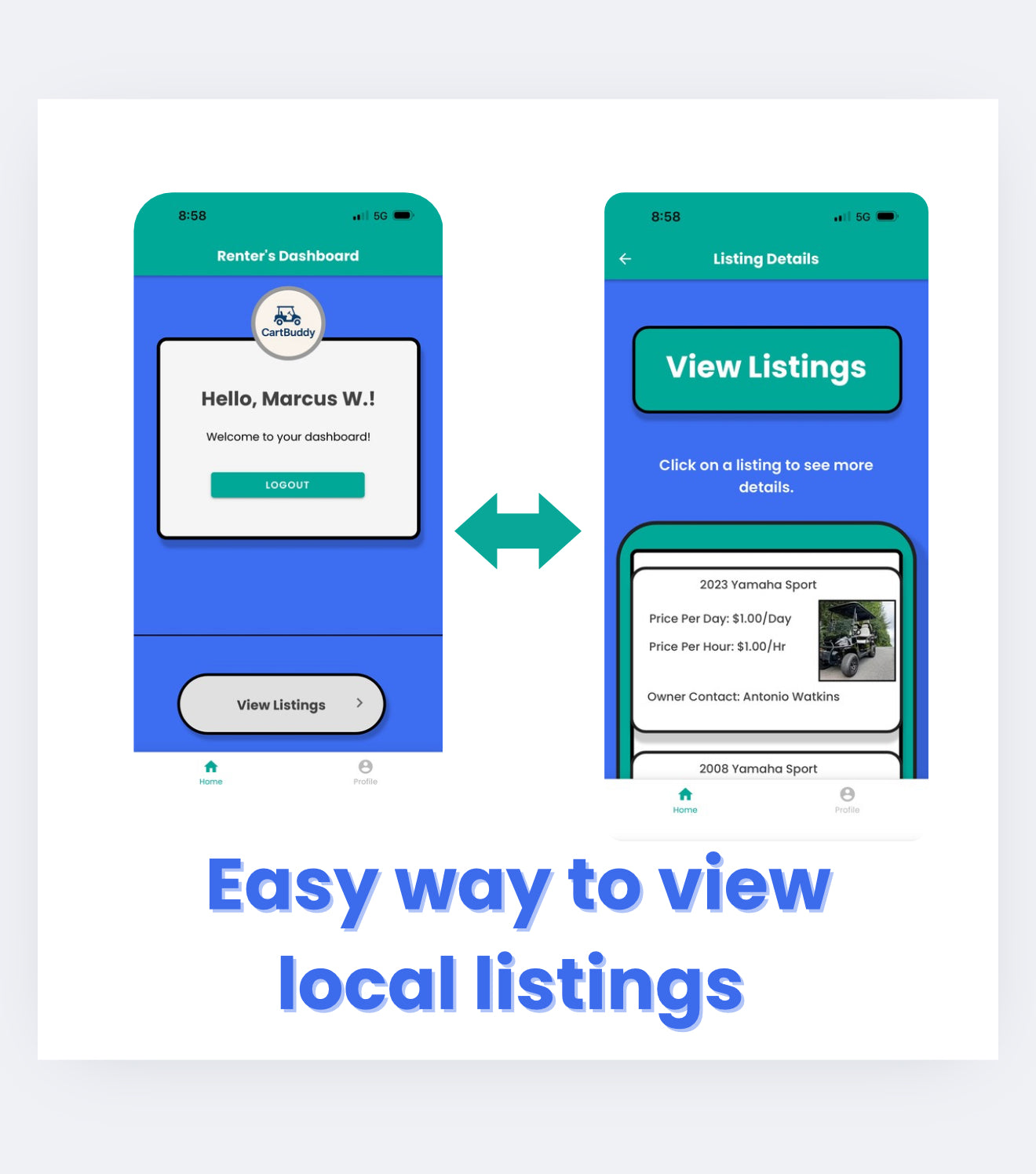 Owners can list & edit their listings. We allow owners to set their own prices for hourly and daily rentals to have full control over their Cart Buddies™️ income. The app is equipped with a messaging system to allow users to message each other about booking inquiries and preferences.